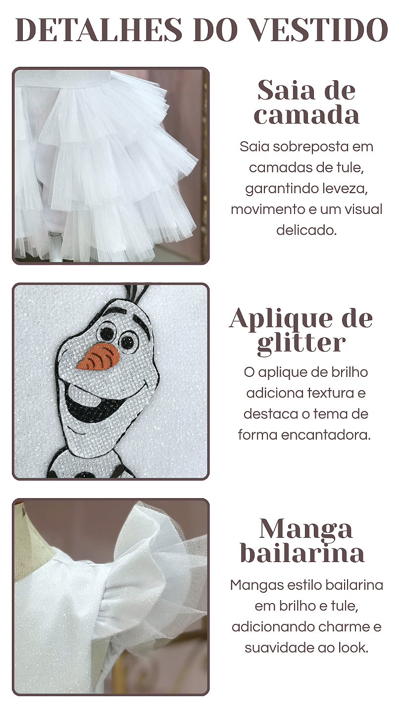 Com corpo em tecido de brilho e um aplique exclusivo do Olaf em glitter, mangas estilo bailarina que unem tule e brilho, e uma saia em camadas de tule volumosa, o macaquinho encanta logo no primeiro olhar. A combinação dos detalhes cria um visual criativo e sofisticado, perfeito para aniversários, festas de Frozen, ensaios fotográficos e momentos inesquecíveis.