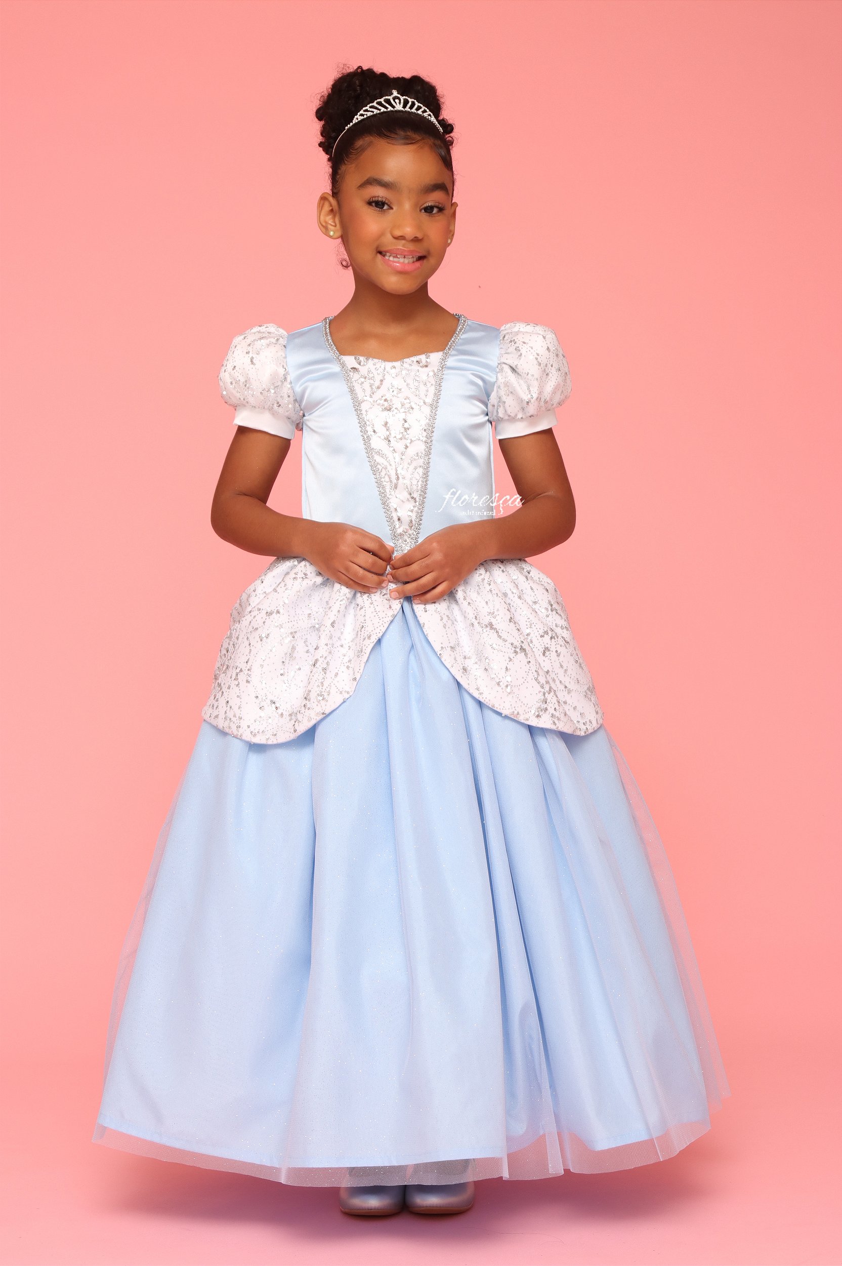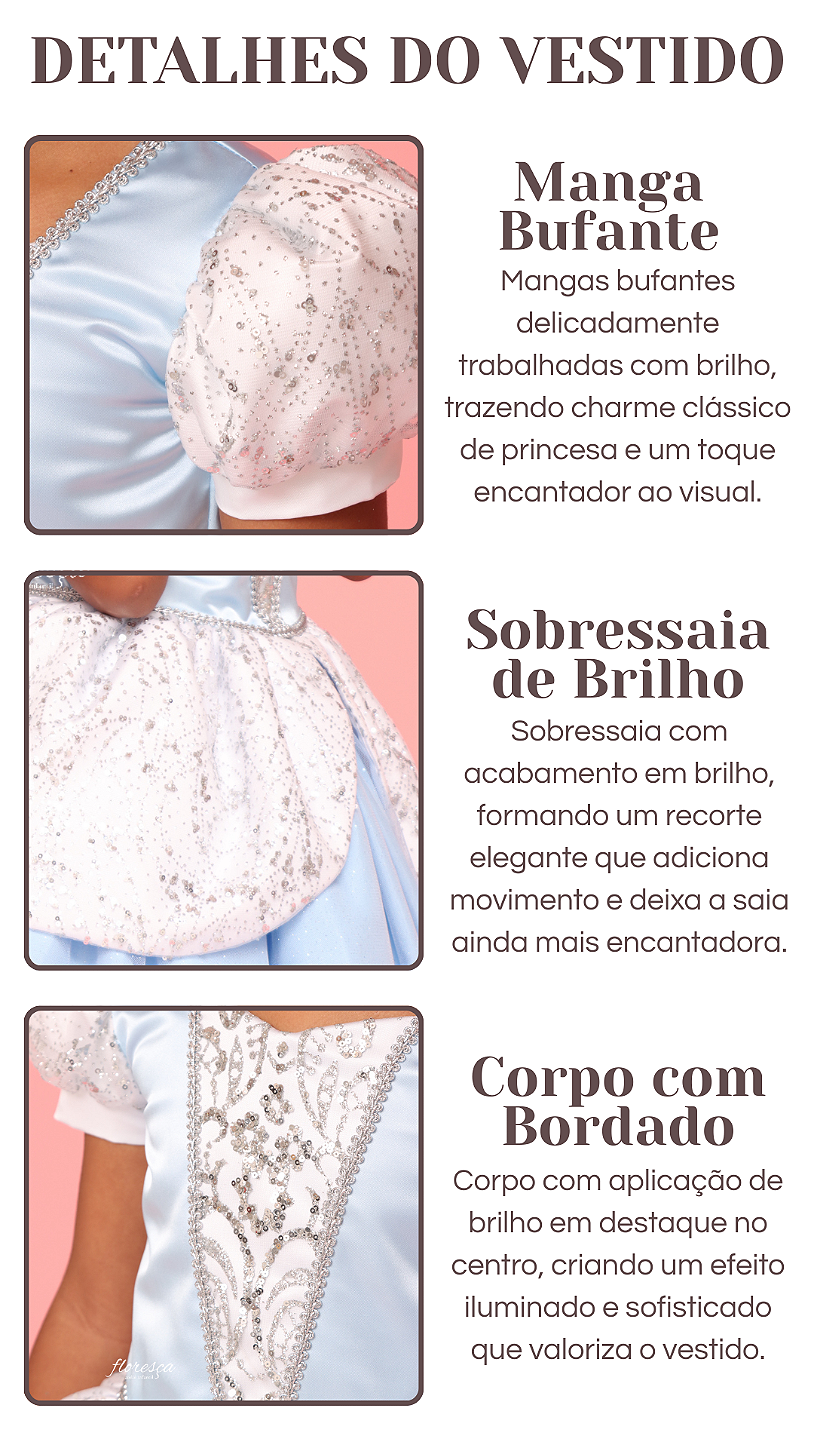 Dica Floresça: combine o vestido com acessórios delicados, como tiaras prateadas, sapatilhas ou penteados suaves, para realçar ainda mais a inspiração da princesa Cinderela. O vestido Cinderela é a escolha ideal para transformar a festa infantil em um momento mágico, elegante e cheio de encanto.