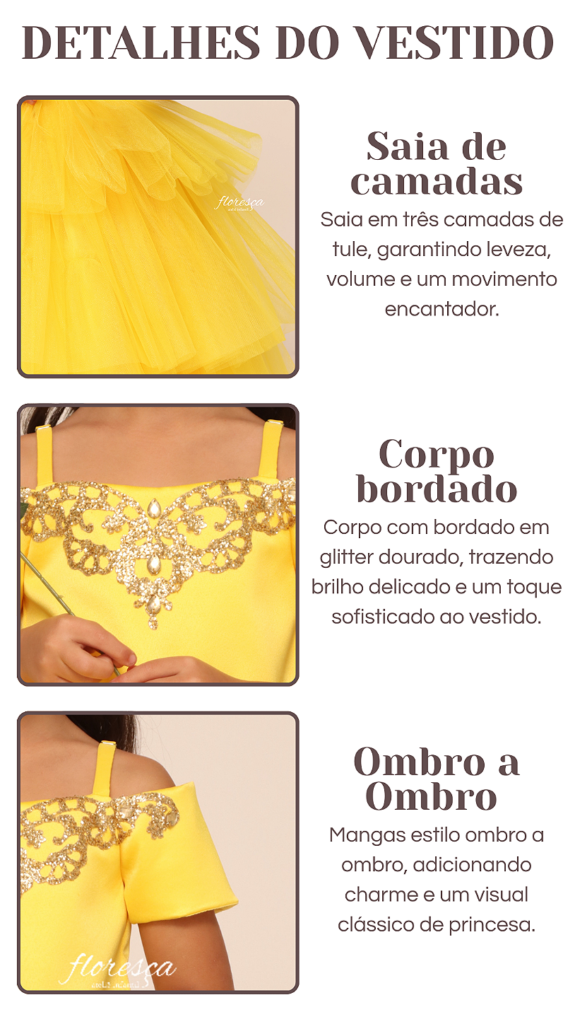 Com corpo delicadamente bordado em brilho dourado e saia ampla em tule com camadas volumosas, o vestido encanta logo no primeiro olhar. O brilho suave aliado ao volume da saia cria um efeito deslumbrante, perfeito para aniversários, festas temáticas, ensaios fotográficos e momentos inesquecíveis.