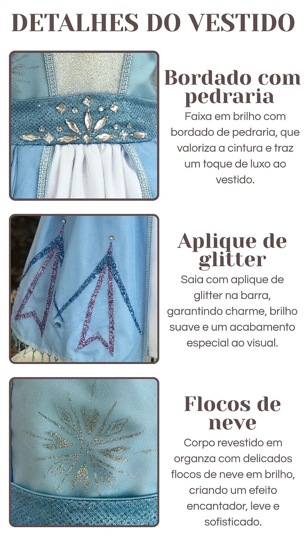 Com corpo em tecido de brilho delicado, recortes clássicos e mangas bufantes que remetem ao estilo da personagem, o vestido encanta em cada detalhe. A saia fluida, com sobreposição leve e acabamento cuidadoso, garante movimento e leveza, criando um visual mágico e harmonioso, perfeito para aniversários, festas Frozen, ensaios fotográficos e celebrações inesquecíveis.