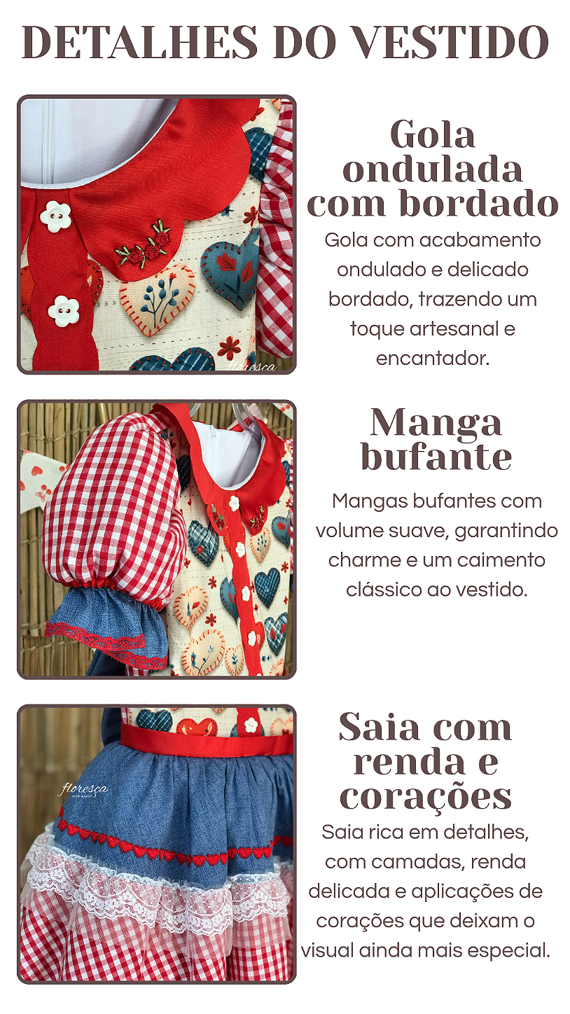 Dica Floresça: combine o vestido com sapatilhas, laços ou acessórios em tons de vermelho para destacar ainda mais o visual junino. O Vestido Infantil Coração Xadrez Festa Junina é perfeito para quem deseja um look romântico, alegre e cheio de estilo para brilhar nas festas.