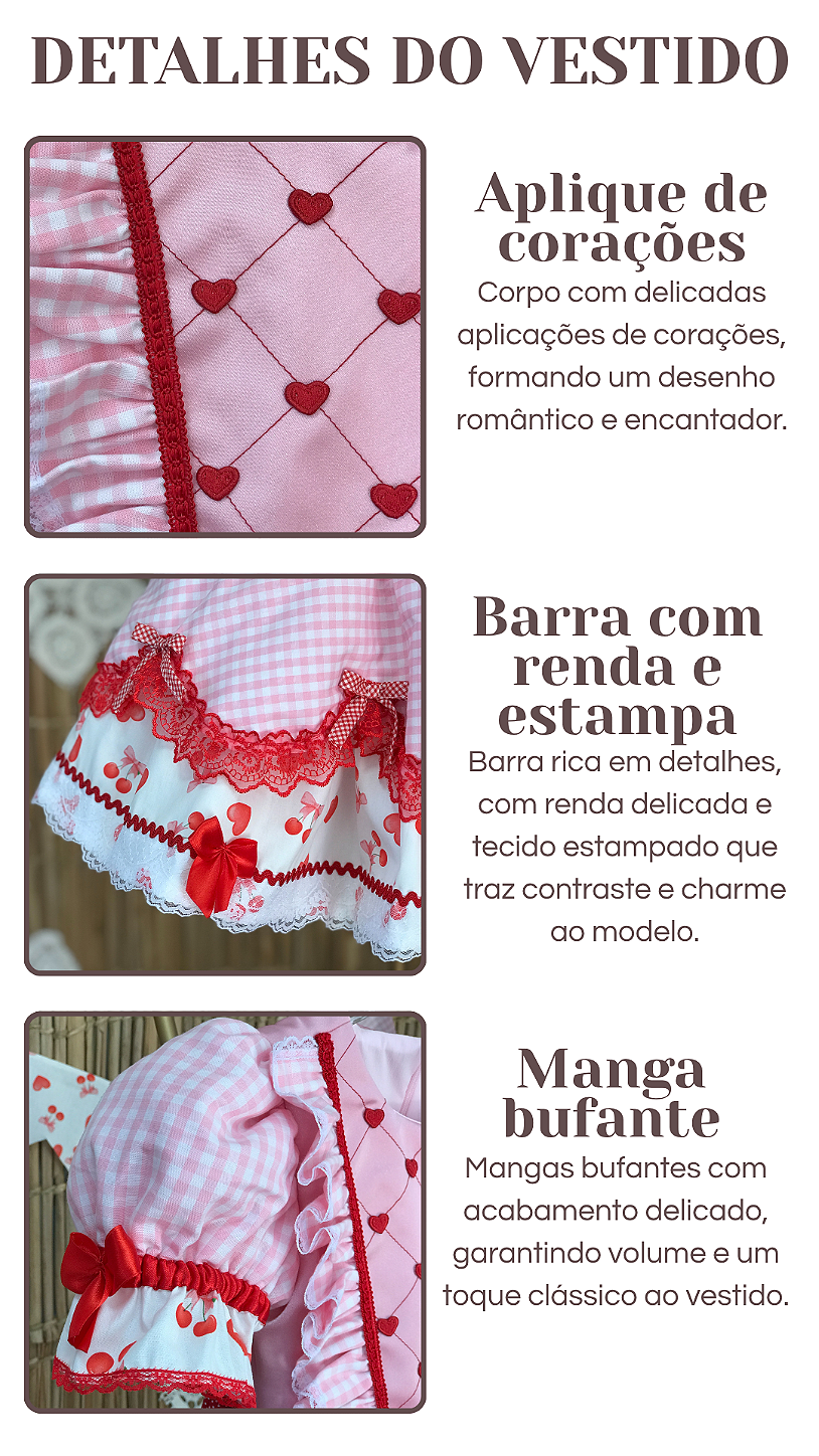 Design Encantador: Vestido infantil com inspiração romântica, trazendo um visual leve e encantador. O modelo combina estampa de corações com detalhes em xadrez, criando uma composição harmoniosa e delicada. Os acabamentos em renda e os laços aplicados enriquecem a peça com um toque especial, enquanto as mangas bufantes e o caimento da saia garantem movimento e elegância. O caimento é confortável e pensado para proporcionar liberdade de movimento, permitindo que a criança aproveite cada momento com leveza e alegria.