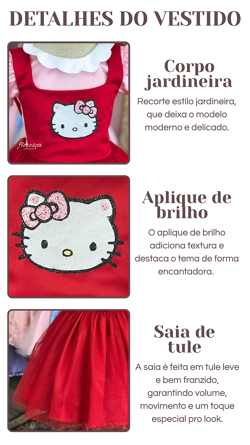 Dica Floresça: Combine com laço vermelho, presilha rosada ou tiara delicada para completar o look. O Vestido Hello Kitty é perfeito para transformar qualquer festa infantil em um momento cheio de cor, doçura e muita alegria!