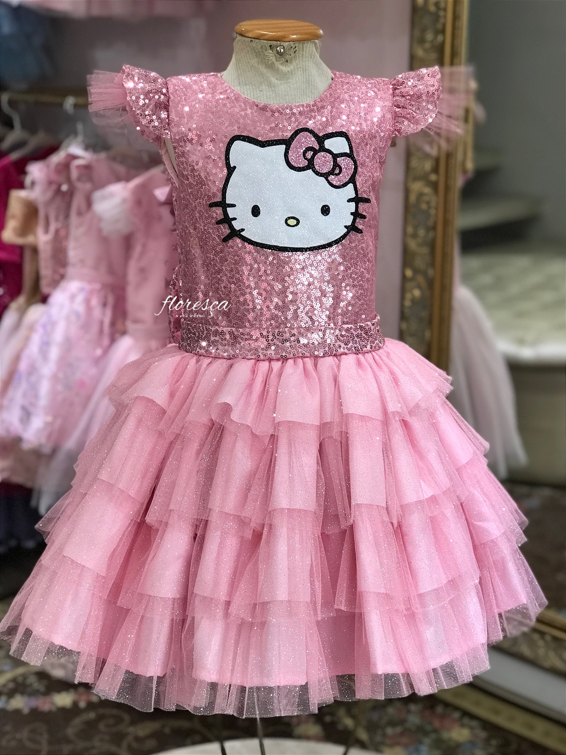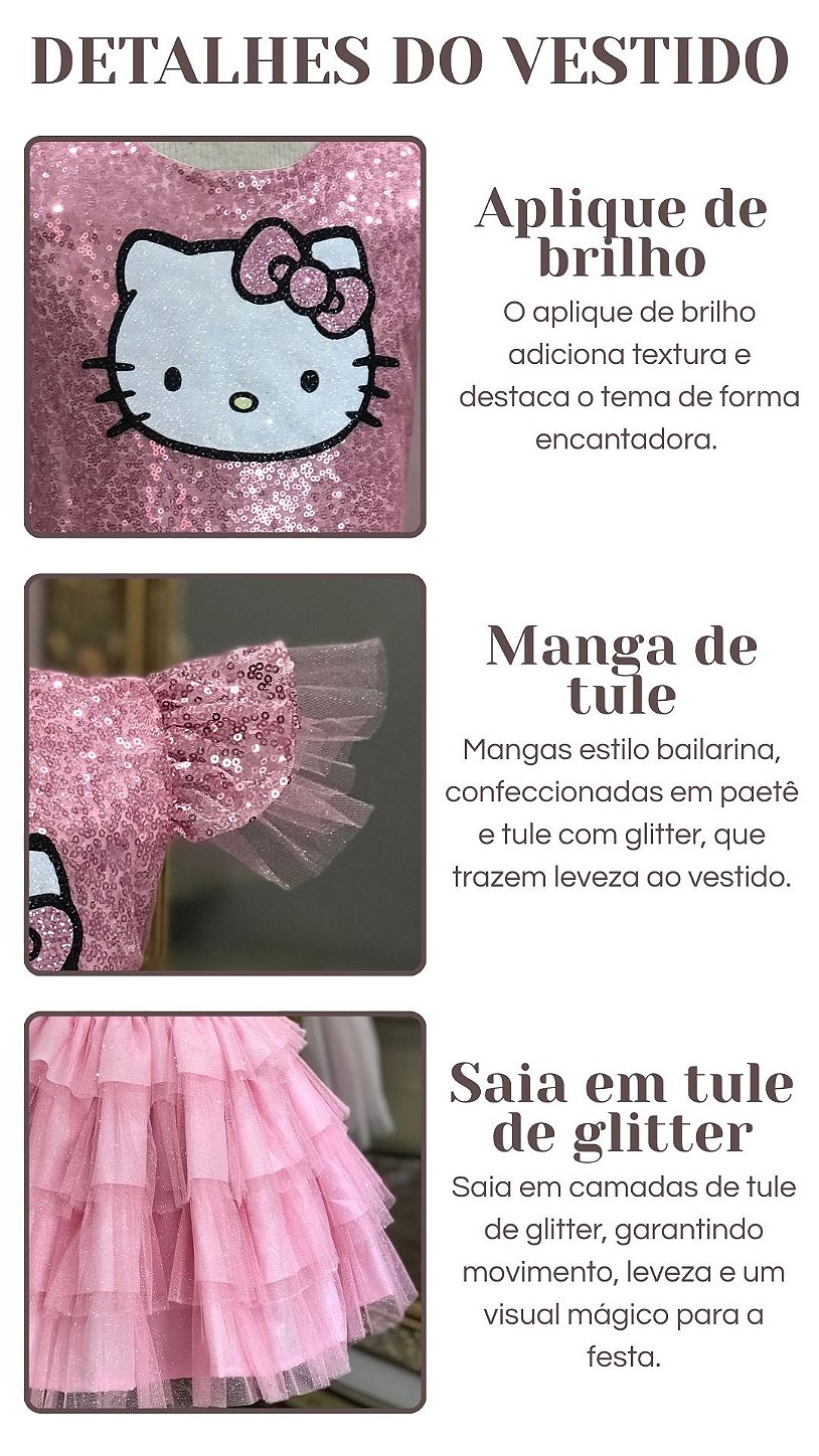 Encante cada momento especial da sua princesa com o Vestido Infantil Hello Kitty, um modelo delicado, cheio de brilho e fofura, perfeito para deixar a festa infantil ainda mais encantadora e valorizar a decoração do evento