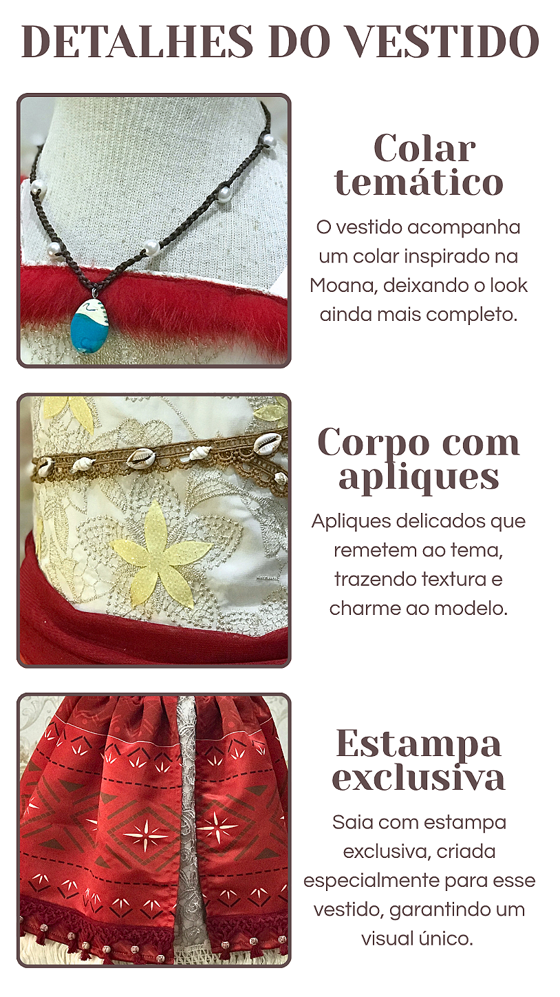 O vestido infantil Moana Filme 2 é a escolha perfeita para quem busca um vestido vermelho para festa infantil com inspiração na personagem mais corajosa do universo infantil. Trazendo o novo visual da Moana, o modelo une autenticidade, detalhes artesanais e aquele toque especial que transforma qualquer tema Moana em um cenário mágico.