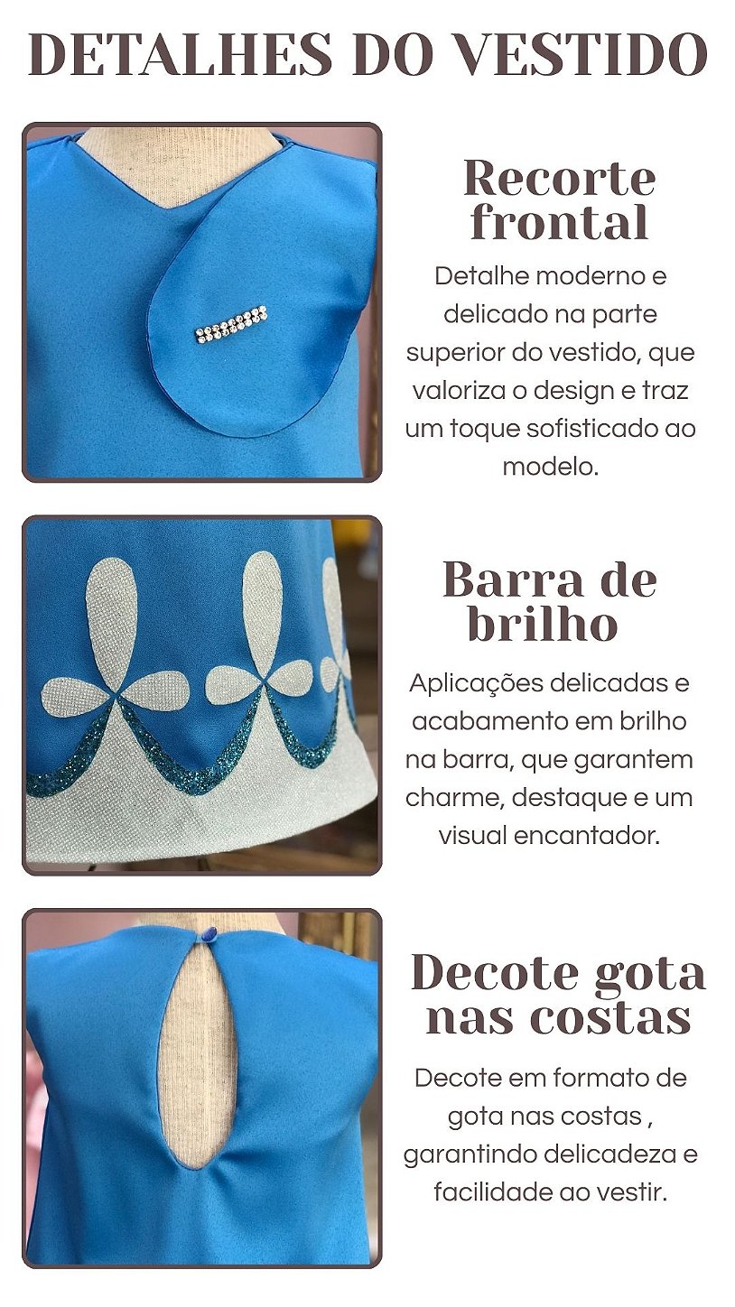 Design Encantador: Vestido infantil modelo trapézio em tom azul vibrante, com aplique inspirado na personagem Poppy – Trolls, que traz charme e personalidade ao visual. O destaque fica por conta do recorte frontal assimétrico na parte superior, um detalhe delicado que valoriza o design do vestido. Os apliques decorativos e a barra com acabamento em brilho garantem um toque especial, deixando o look ainda mais gracioso e encantador.