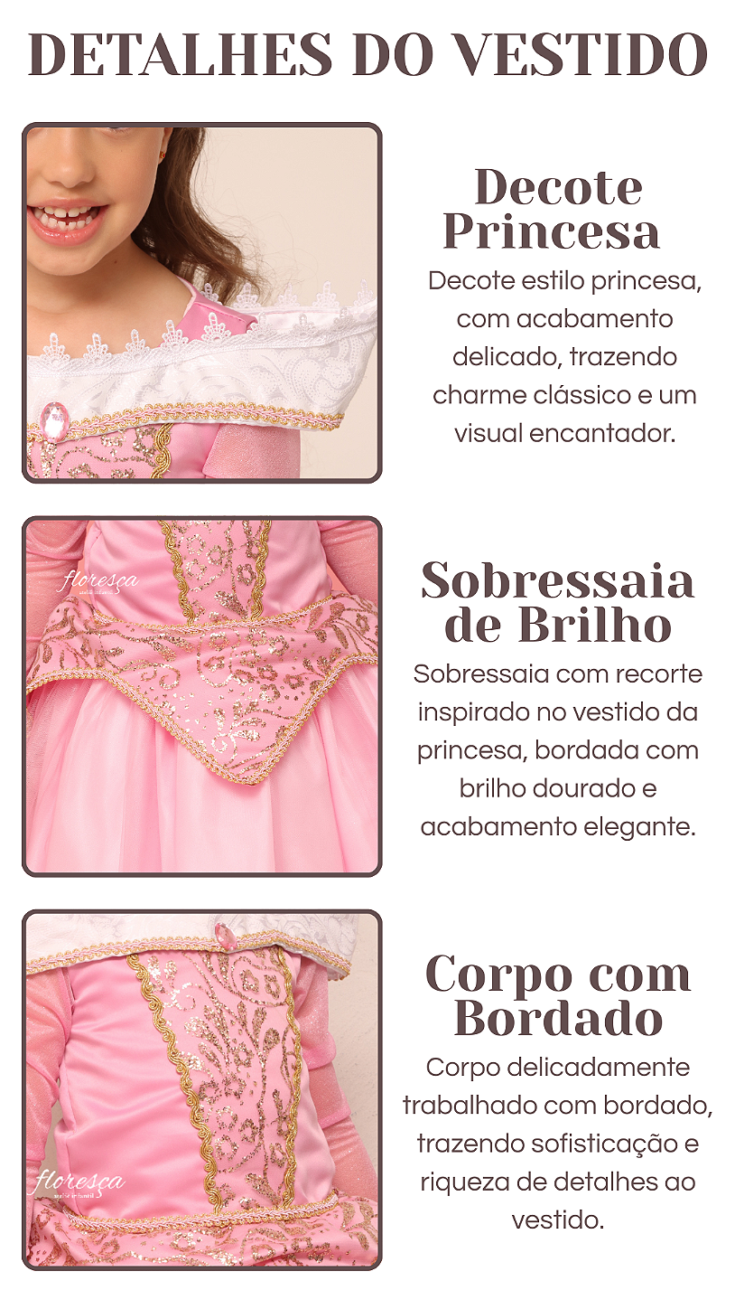 Dica Floresça: combine o vestido com acessórios delicados, como tiaras douradas ou penteados suaves, para destacar ainda mais a inspiração da princesa Aurora. O vestido Aurora é a escolha ideal para transformar a festa infantil em um momento mágico e cheio de encanto.