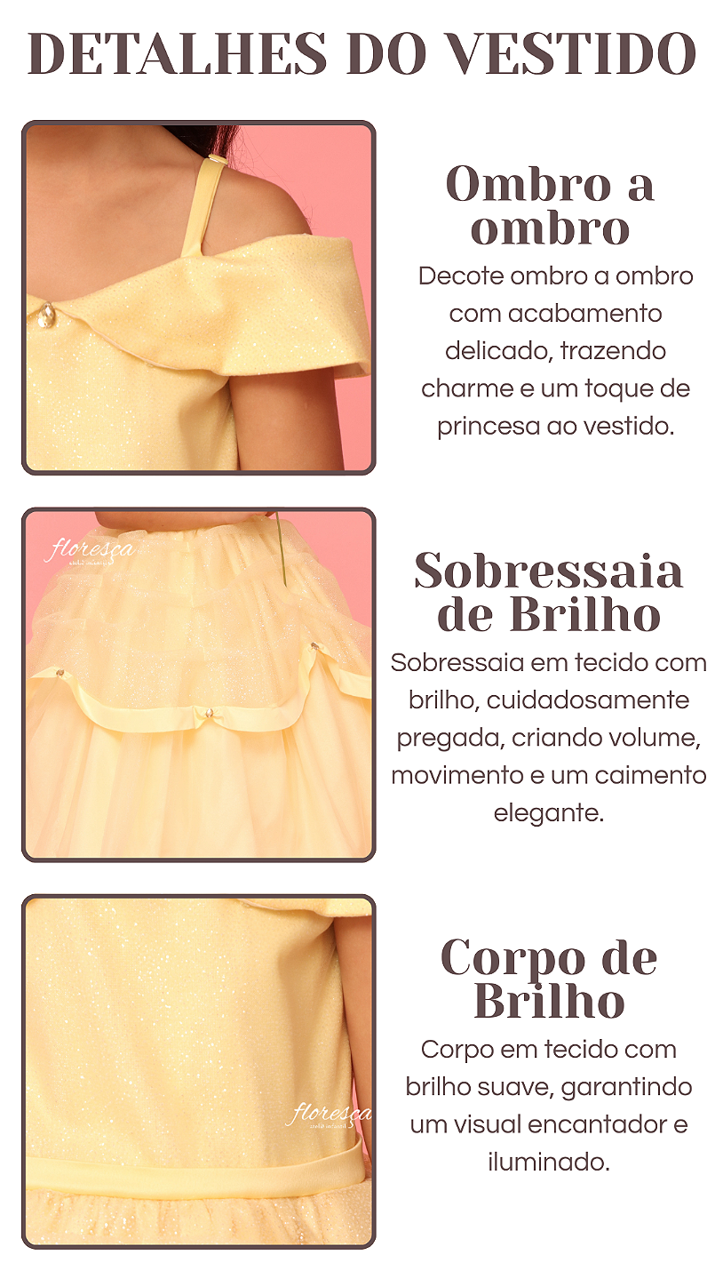 Design Encantador: Corpo com brilho delicado, decote ombro a ombro e saia em camadas de tule com brilho suave, formando um visual harmonioso, elegante e perfeito para festa infantil.