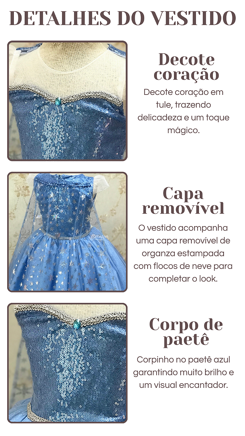 O decote coração com tule transparente traz a delicadeza clássica da personagem, deixando o vestido leve, elegante e fiel ao visual da Elsa. O corpinho em paetê azul garante muito brilho, criando um efeito especial que se destaca nas fotos e encanta desde o primeiro olhar. Para completar, a capa removível em tule estrelado adiciona movimento e aquele toque mágico que toda pequena fã de Frozen ama.