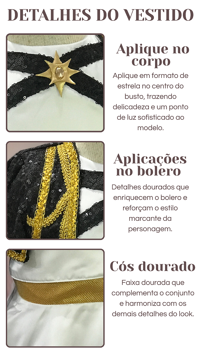 Com bolero em paetê preto e aviamentos em dourado, o conjunto ganha destaque logo no primeiro olhar. O top em cetim com aplique central complementa a proposta do figurino, enquanto os detalhes dourados reforçam a identidade da personagem e deixam o visual ainda mais impactante.