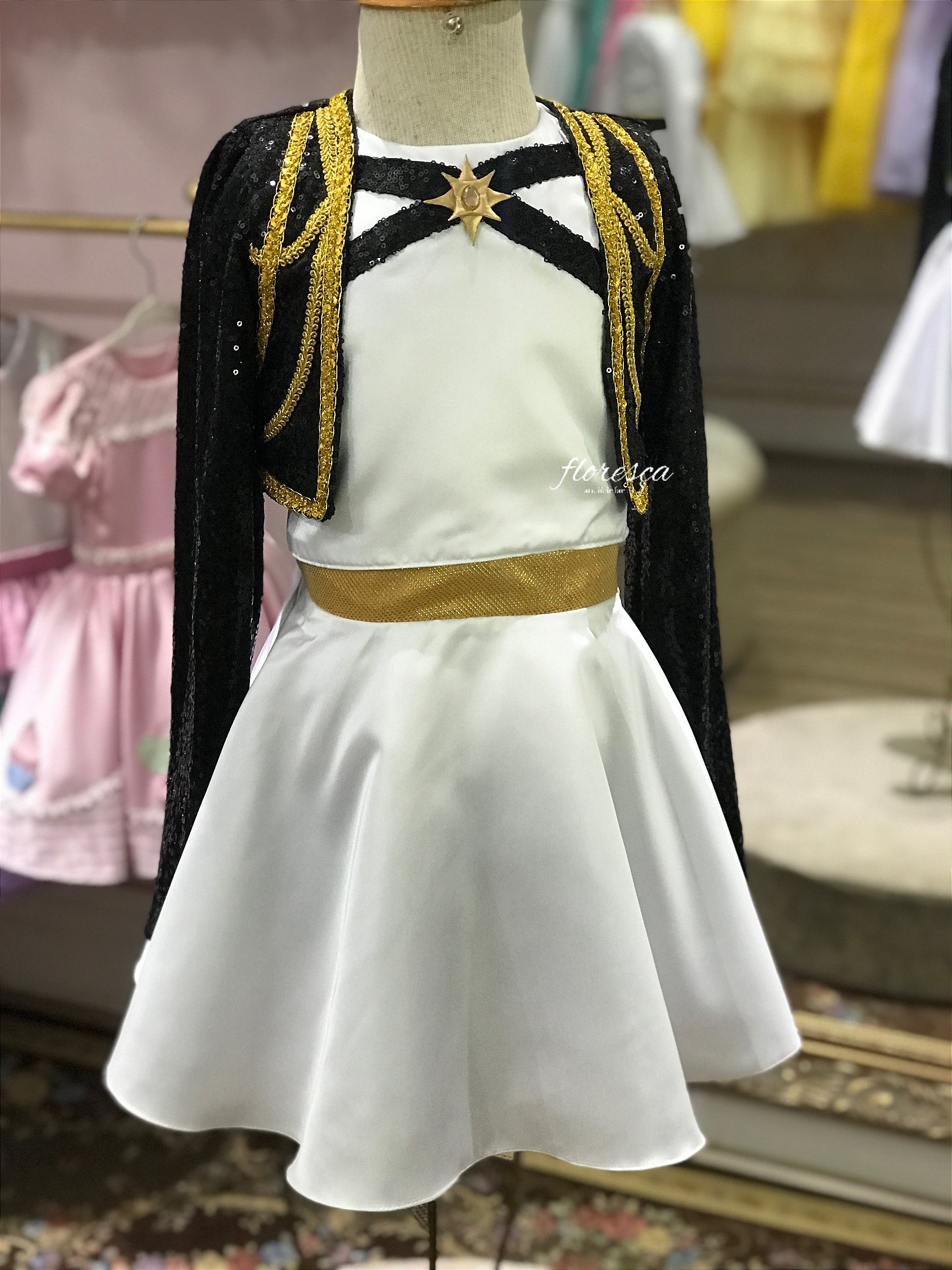 Design Encantador: Modelo inspirado na Rumi, com bolero em paetê preto e aviamentos em dourado que trazem destaque e personalidade ao look. A blusa em cetim possui aplique central que reforça a identidade do figurino, enquanto a saia godê em cetim garante movimento e leveza para completar a produção.