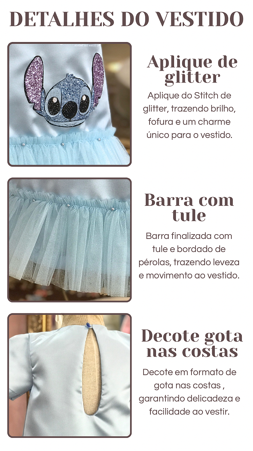 Design Encantador: Modelo trapézio em tom azul bebê, com aplique do Stitch em glitter aplicado à mão, garantindo brilho e destaque com delicadeza. As manguinhas delicadas e a barra de tule dão um toque gracioso ao visual, deixando o vestido leve e encantador.