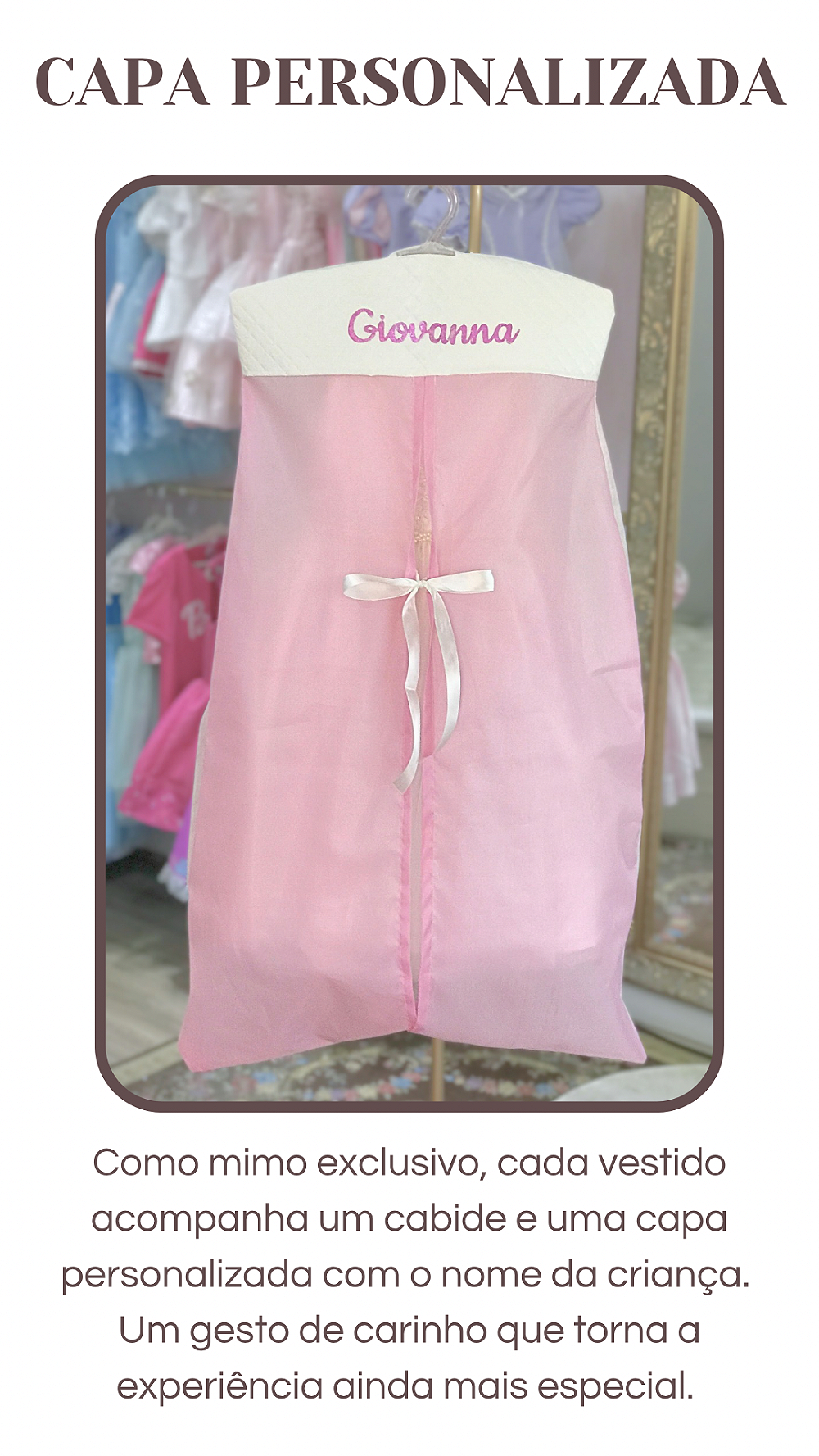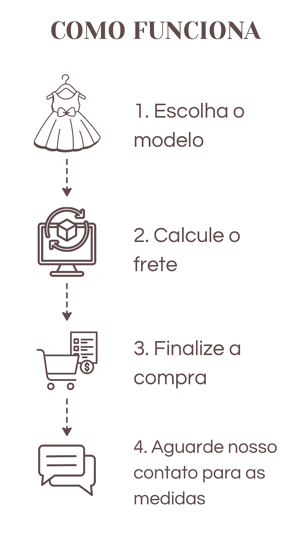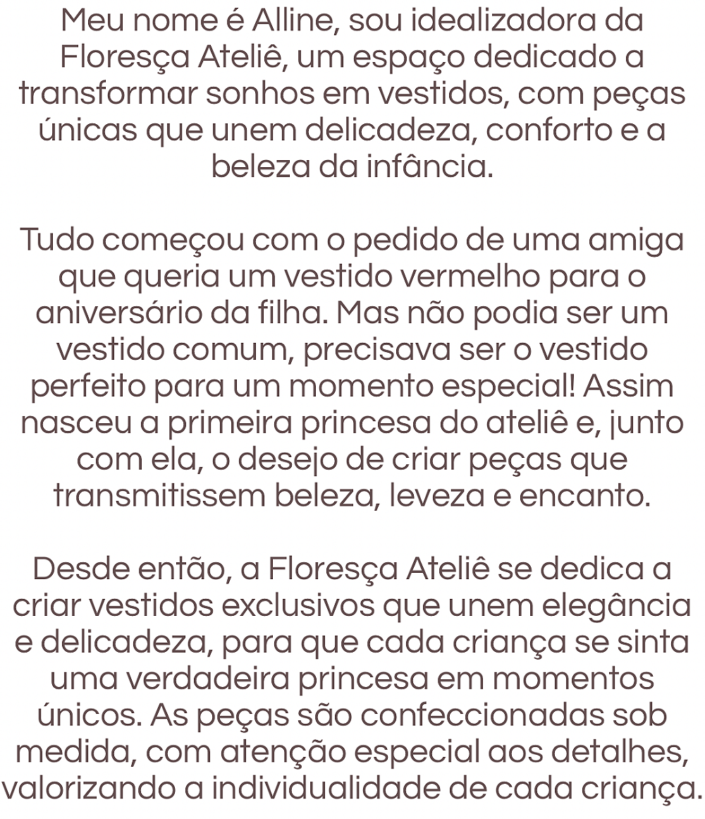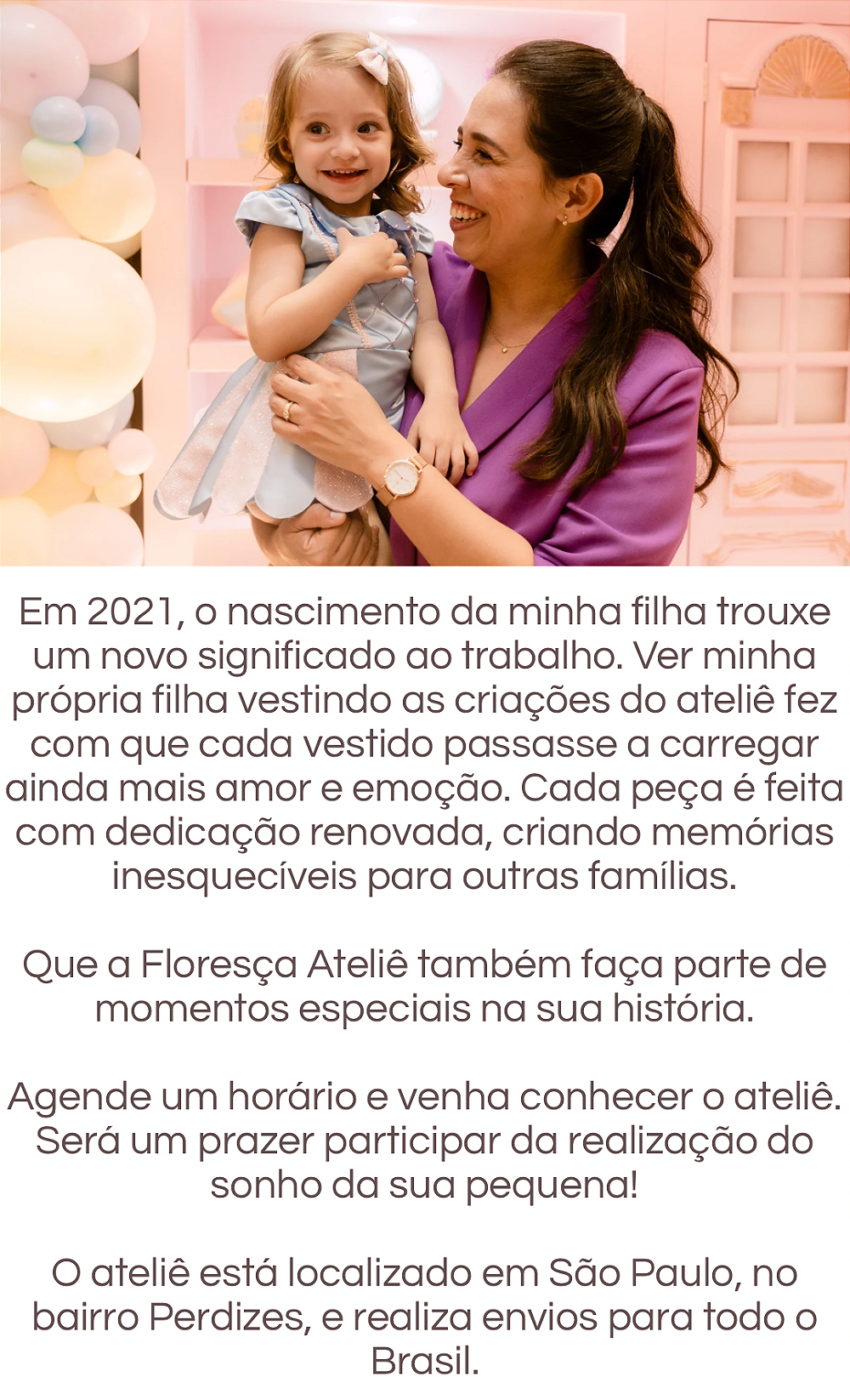 Somos um ateliê infantil, nossos vestidos são exclusivos e personalizados. Podemos criar o modelo do jeitinho que você sonhar, com opções de cores, tecidos e detalhes. Caso queira realizar alguma alteração neste modelo ou solicitar um novo, entre em contato.