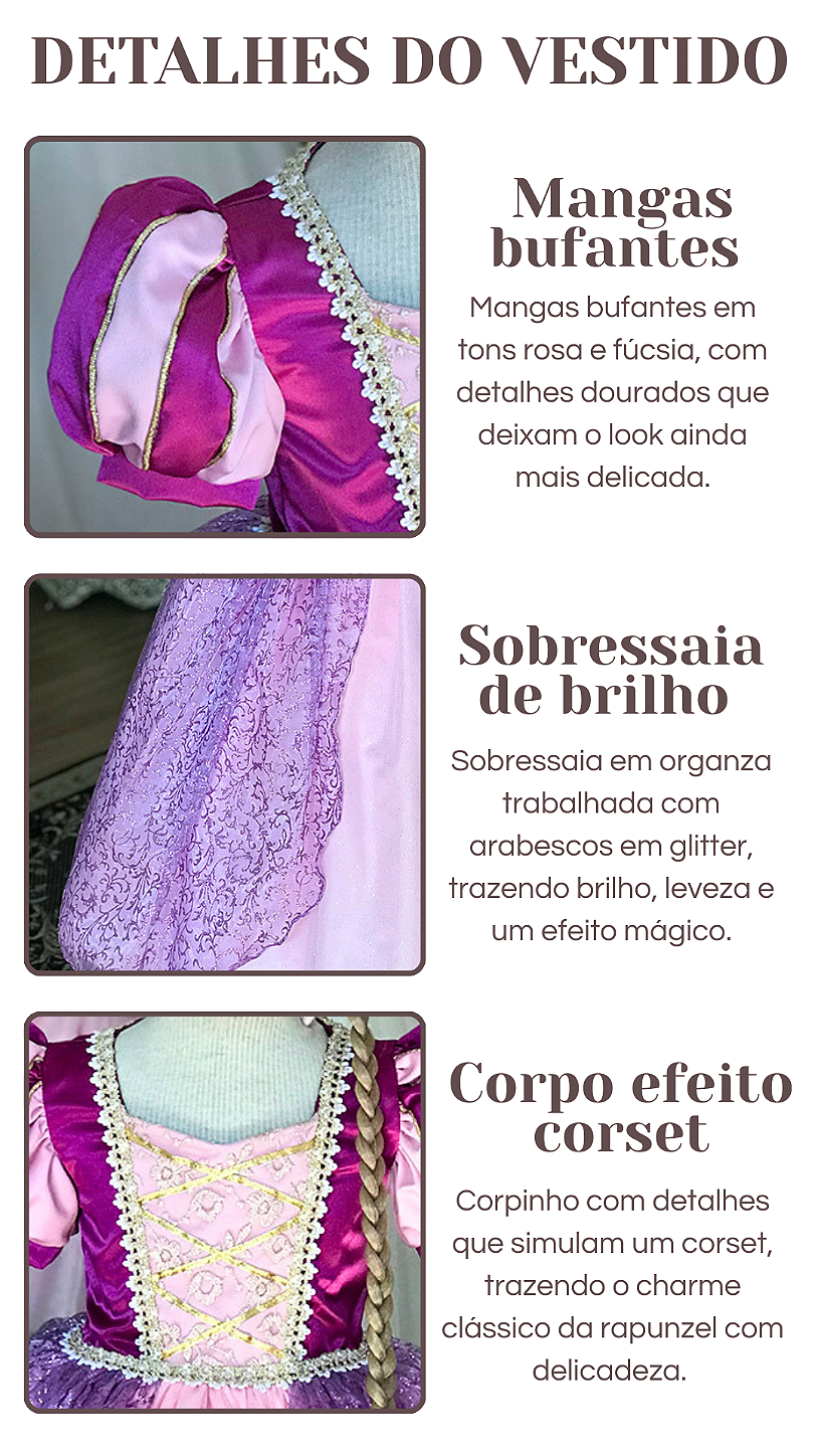 Design Encantador: Corpinho com simulação de corset, rendas delicadas e detalhes clássicos que remetem ao traje original da Rapunzel. As mangas bufantes em rosa e roxo com filetes dourados deixam o look ainda mais fiel e encantador. A sobressaia em organza com arabescos em glitter traz brilho e movimento, completando o visual de princesa com perfeição.